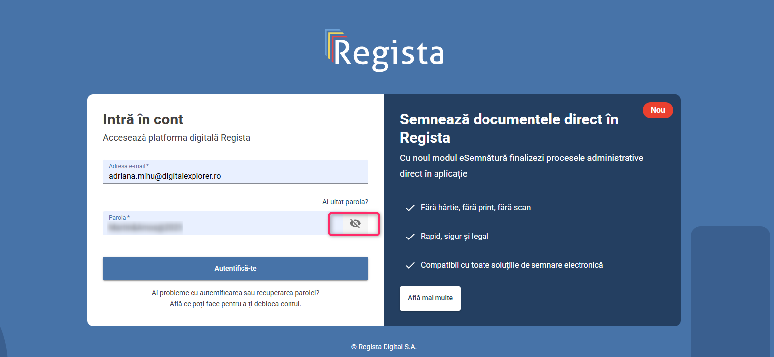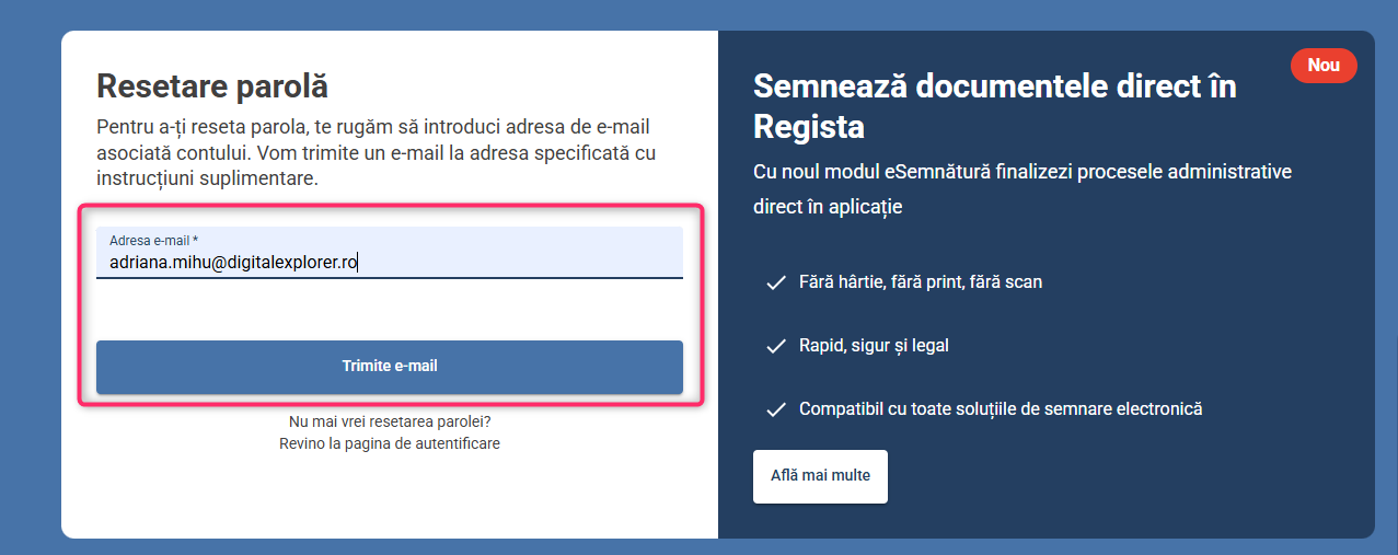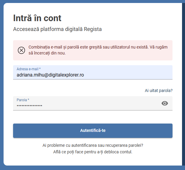 Dacă sunteți în această situație și vă logați în aplicația Regista cu o adresă de email invalidă, resetarea parolei direct de către dumneavoastră, nu este posibilă.