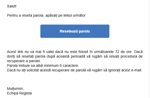 Pasul 4: Veți primi un email din partea noreply@regista.ro. Accesați link-ul din e-mail (disponibil pentru 72 de ore), pentru a seta o nouă parolă.