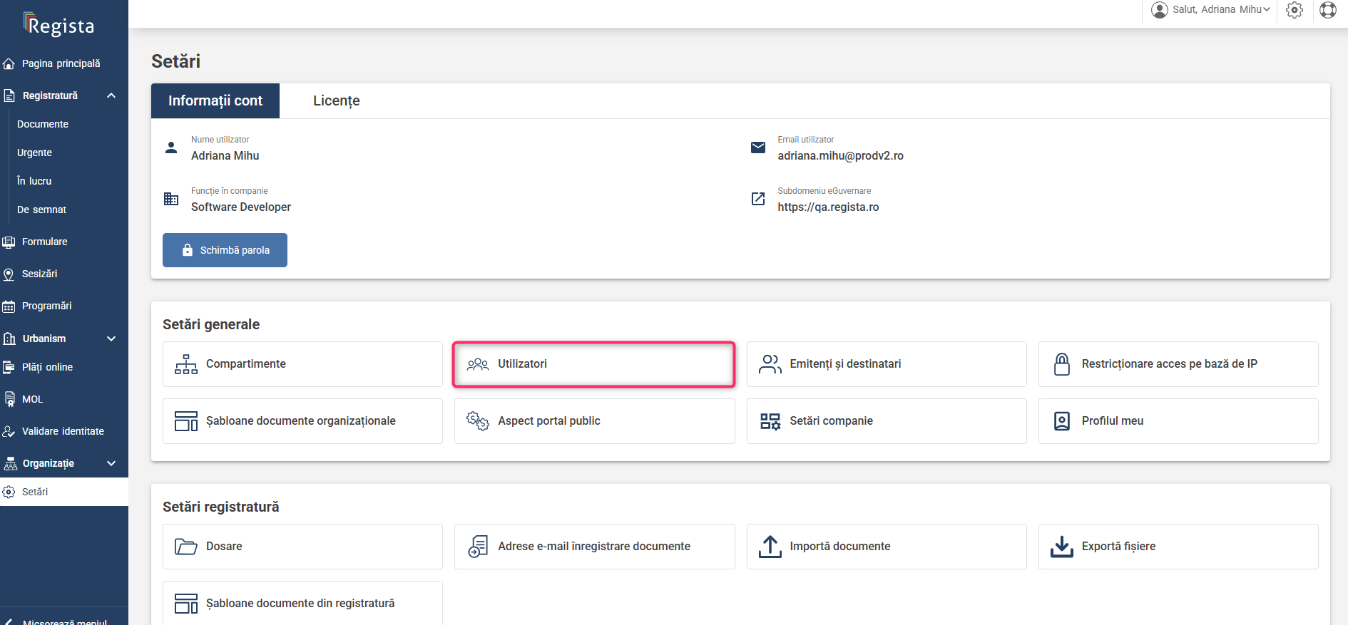 Pasul 2: Se intră în modulul Setări-> Utilizatori