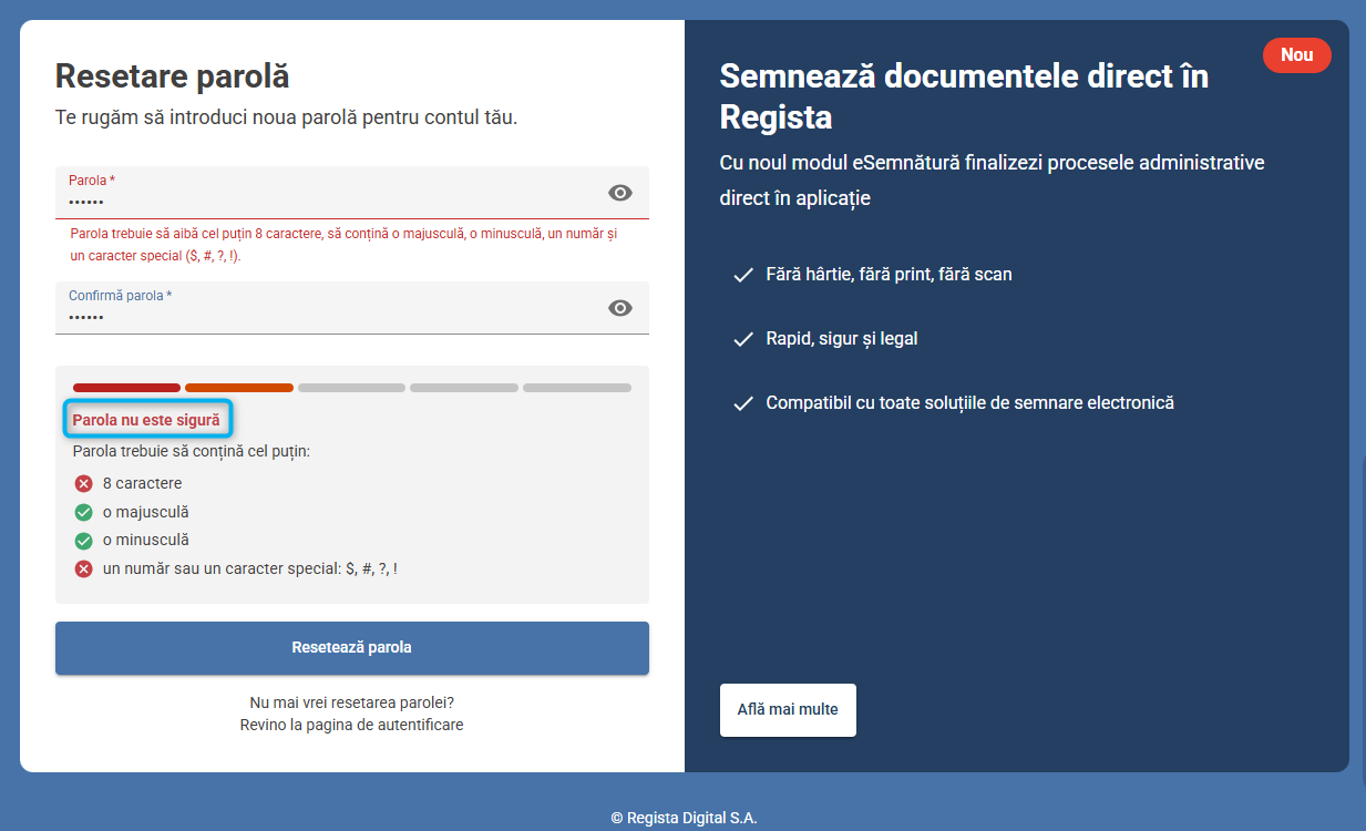 Aceasta trebuie să conțină minim 8 caractere, o majusculă, o minusculă, un număr sau un caracter special: ?!#. În cazul in care nu se întrunesc cerințele de securitate pentru noua parolă, veți primi o atenționare precum cea de mai jos:
