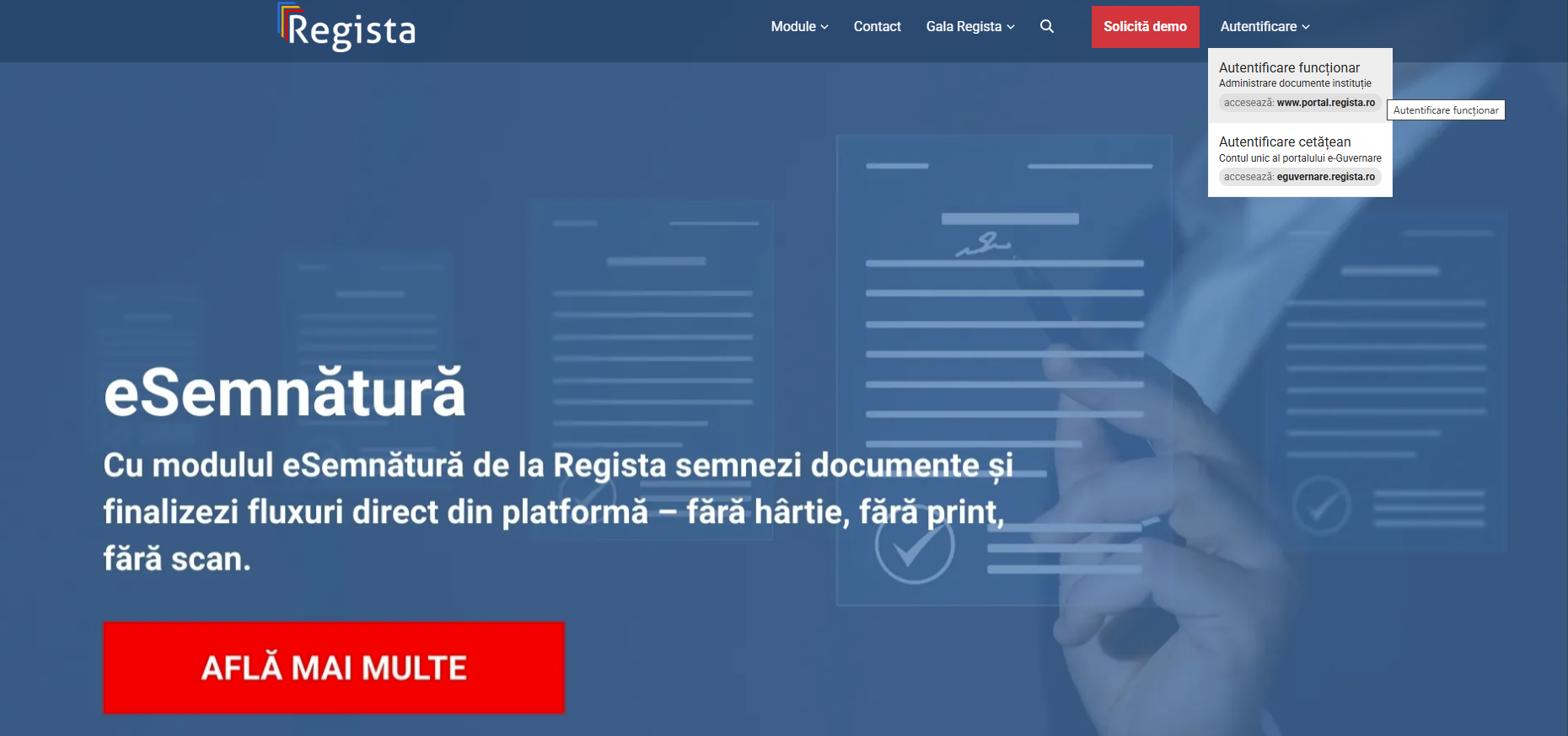 Aplicația Regista este un serviciu cloud, care poate fi accesat direct din browser, fără a necesita instalare. Pentru accesare, utilizatorii pot căuta în bara de căutare Google portal.regista.ro sau simplu, după cuvântul Regista, apoi pot accesa website-ul Regista. În coltul din dreapta sus va fi afișat butonul Autentificare, iar de acolo trebuie selectată prima opțiune: Autentificare funcționar. Pentru autentificarea în aplicația Regista, utilizatorii vor introduce adresa de e-mail și parola asociate contului creat, apoi vor apăsa pe butonul Autentifică-te.