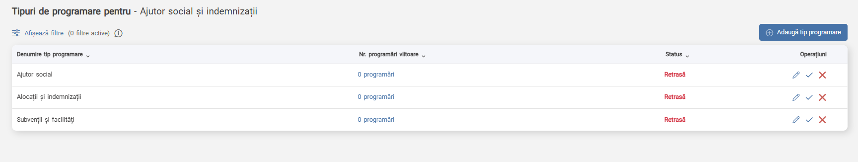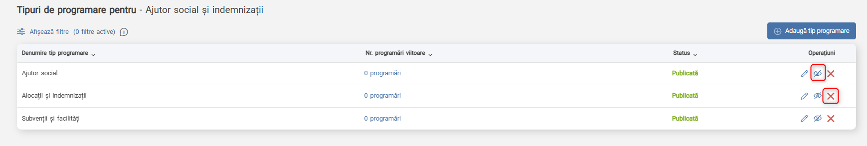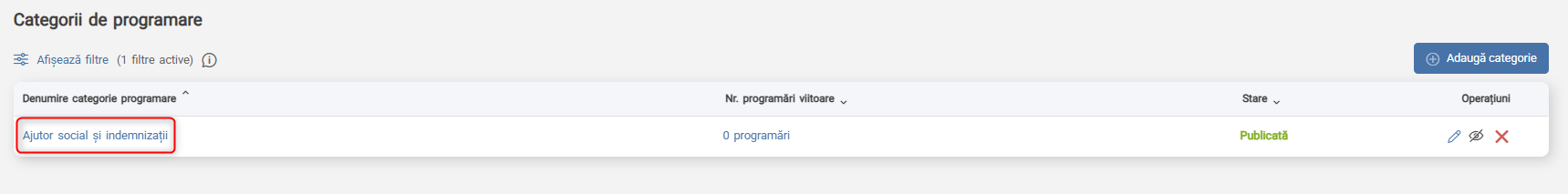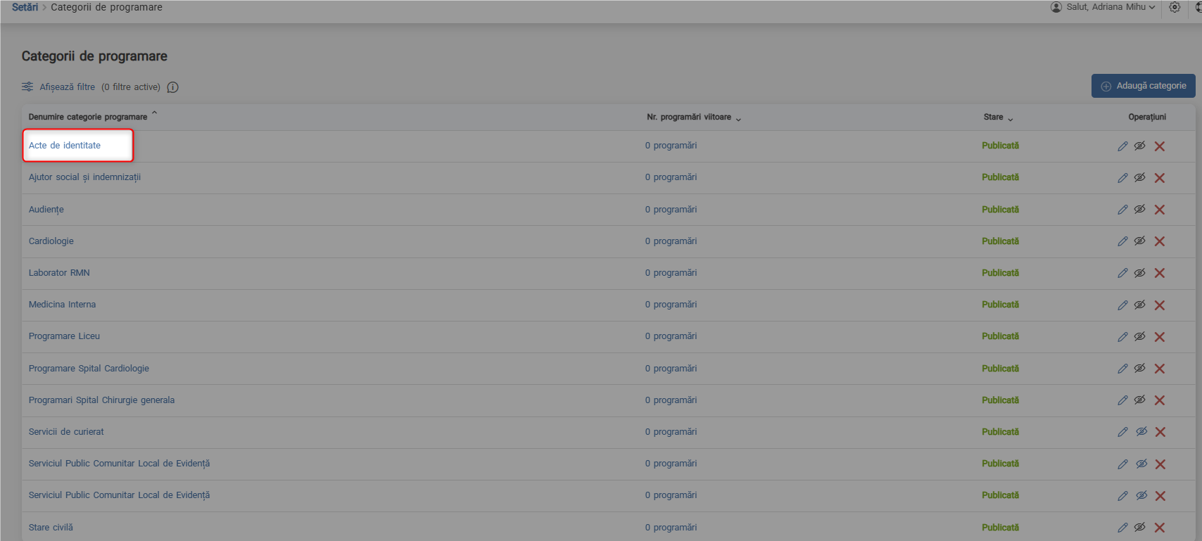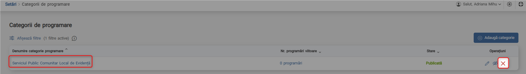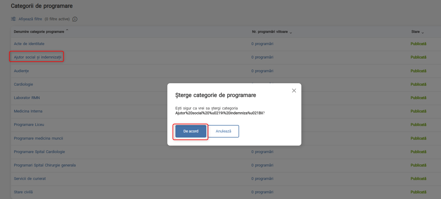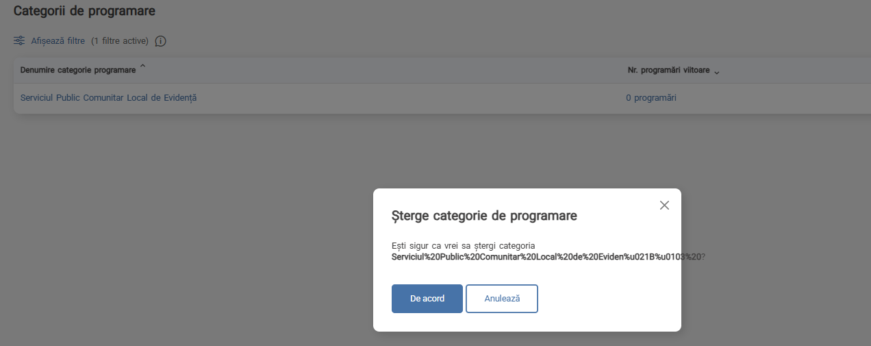 Dacă există cel puțin o programare activă categoria de programare nu poate fi ștearsă. Pentru a o putea șterge, programarea va trebui să fie respinsă de catre persoana care are acces la programare, fie anulată de către solicitant.